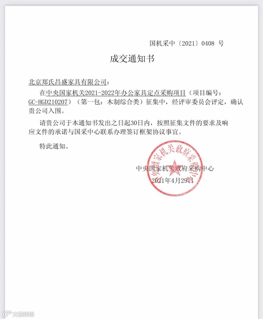 北京郑氏昌盛家具有限公司已入围中央国家机关2021-2022年办公家具定点采购项目