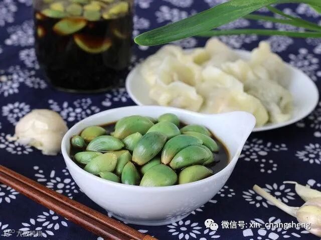 泡腊八蒜是一道主要流行于华北地区的传统小吃,是腊八节的节日食俗。腊八蒜材料其实非常简单,就是醋和大蒜瓣儿。做法也是极其简单,将剥了皮的蒜瓣儿放到一个可以密封的罐子,瓶子之类的容器里面,然后倒入醋,封上口放到一个冷的地方。慢慢地,泡在醋中的蒜就会变绿,最后会变得通体碧绿的,如同翡翠碧玉。
