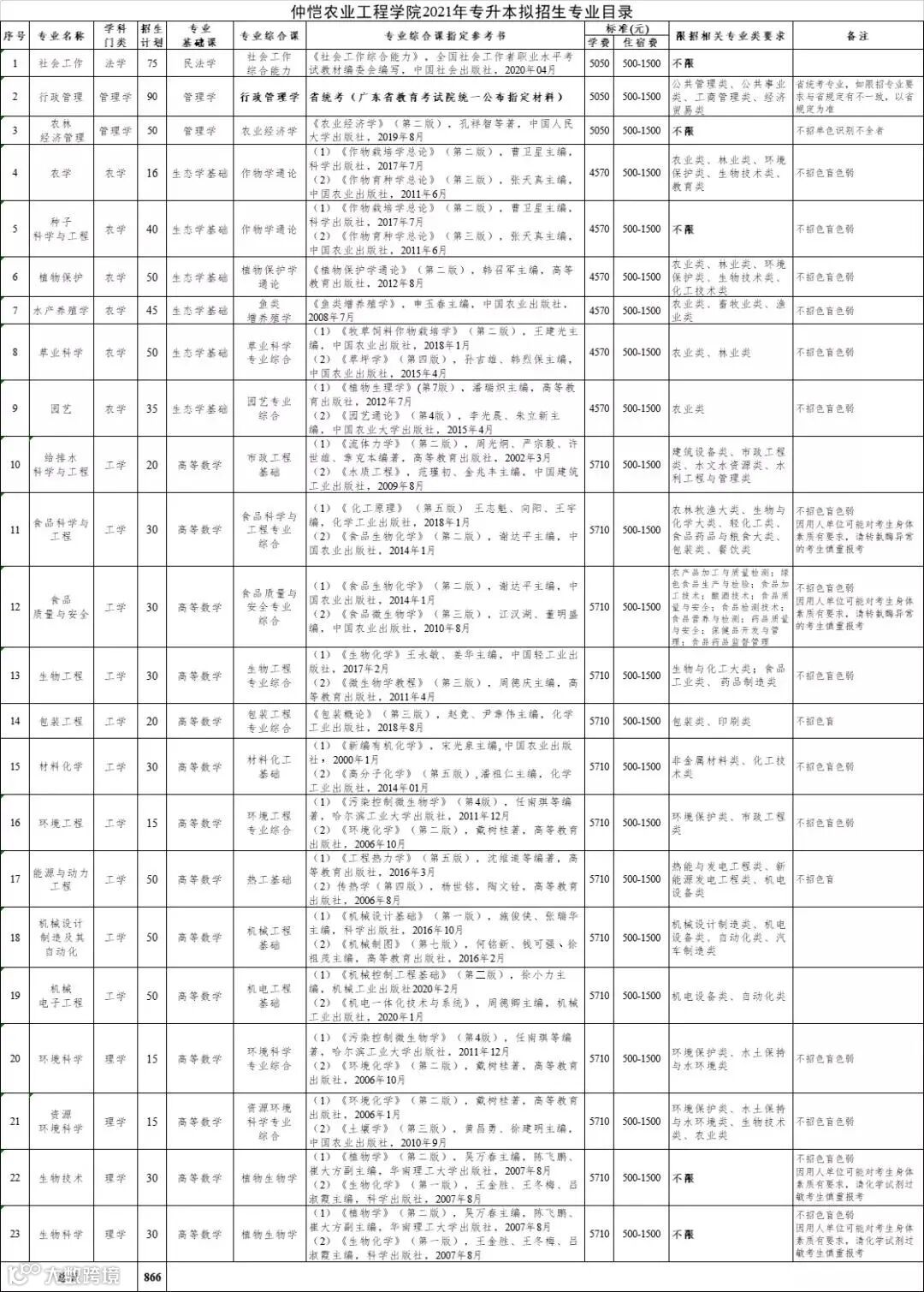 1.我校2021年普通专升本拟招生专业中的“农林经济管理”、“社会工作”、“种子科学与工程”、“生物技术”及“生物科学”五个专业,不限招相关专业类考生。