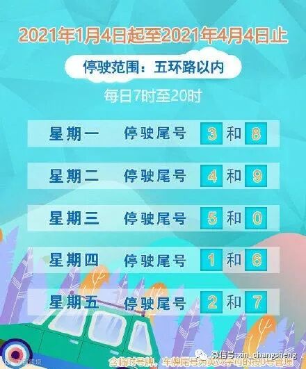 1月4日,北京市将迎来新一轮限行尾号轮换。自2021年1月4日至2021年4月4日,星期一至星期五机动车限行车牌尾号分别为:3和8、4和9、5和0、1和6、2和7。