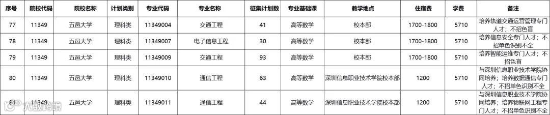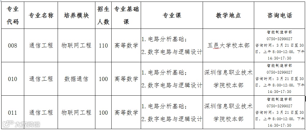 2020年五邑大学设有与深圳信息职业技术学院联合培养的校外教学点,通信工程(数据通信)和通信工程(物联网工程)两个专业均在联合培养院校学习。
