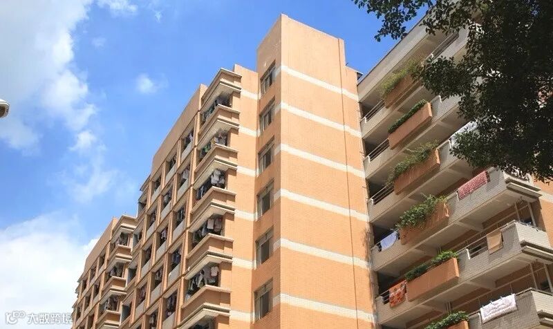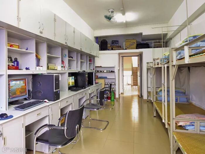 大部分的宿舍布局为3张铁架床,一边是床,分为上铺和下铺,另外一边是6张桌子,桌子上面是一个柜子。有一个公用阳台,然后厕所和浴室是分开的。每幢楼都有共用洗衣机。
