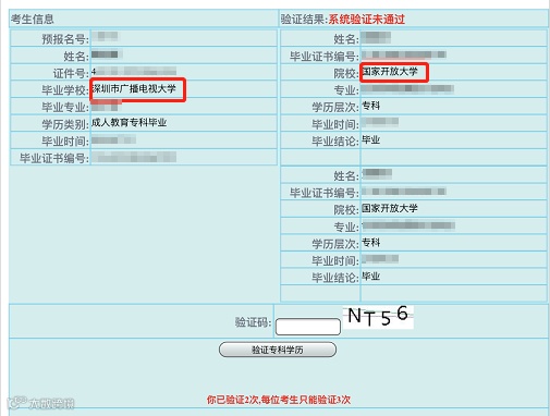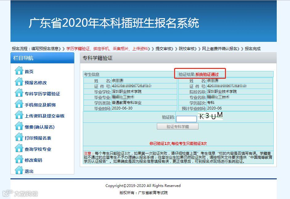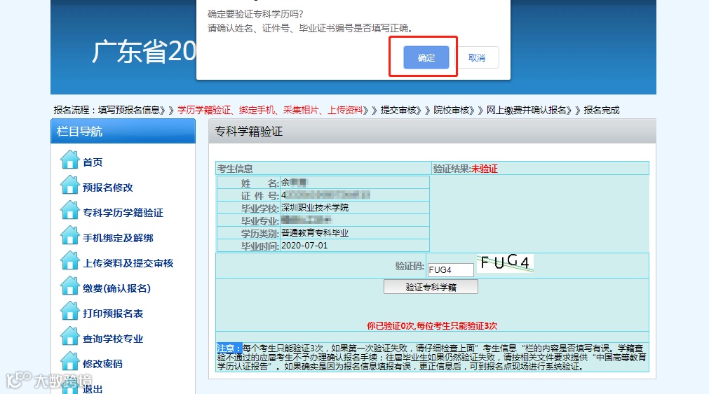 请核对报名资料是否有误,确认无误便可点击“验证专科学历学籍”。注意!每个考生只能验证3次!