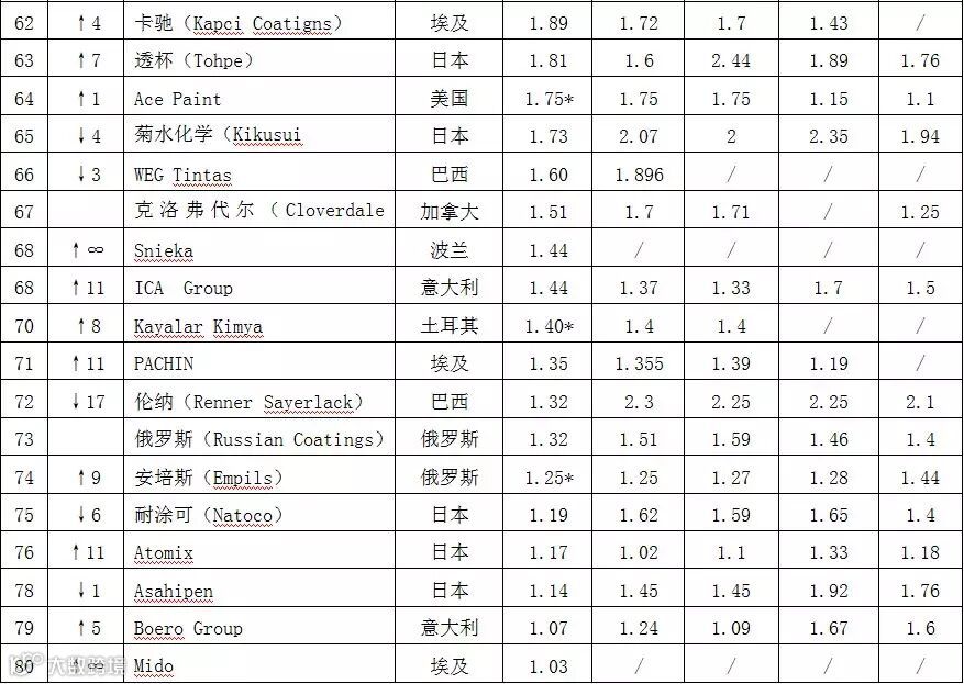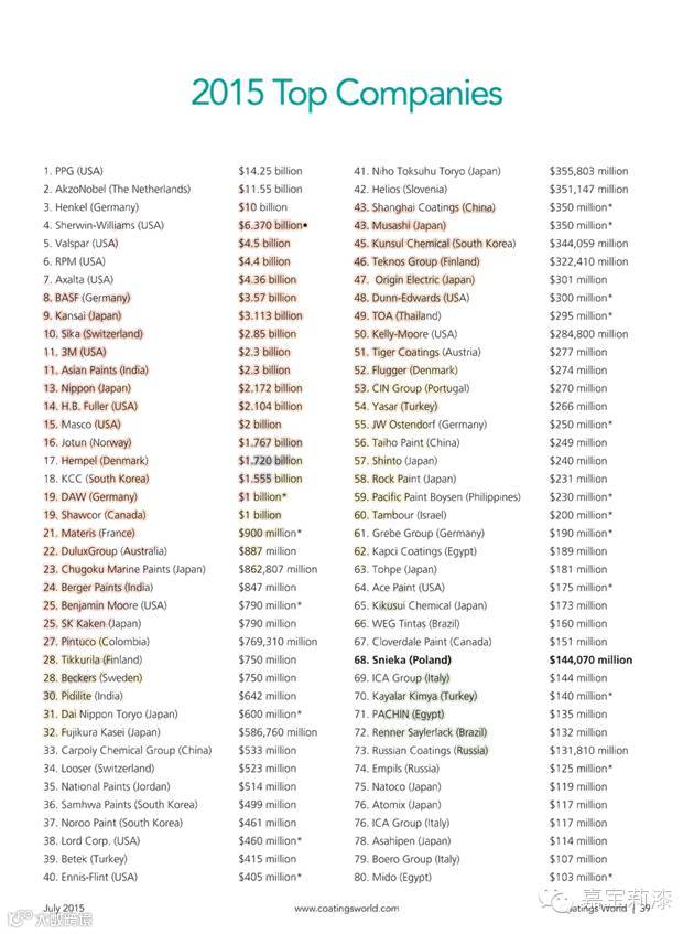 附:2015年全球顶级涂料企业排行榜(前80名)