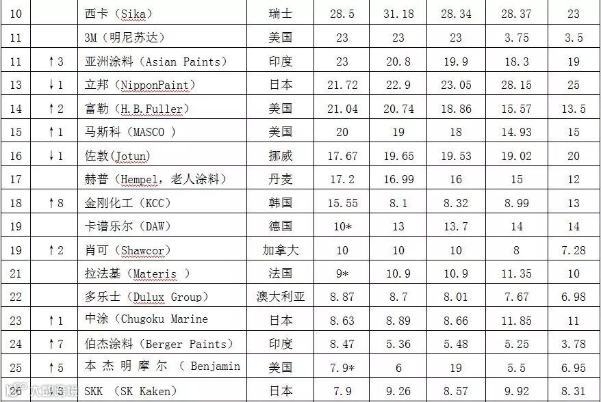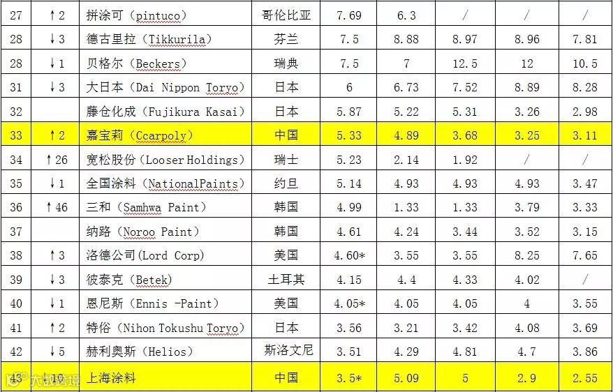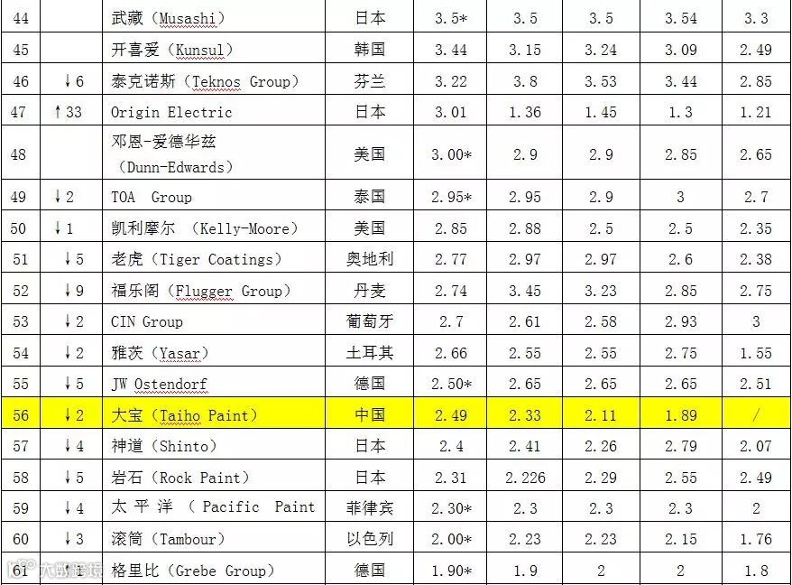 在上榜的3家中国企业中,嘉宝莉以5.33亿美元位列第33位,居上榜中国企业之首。上海涂料以3.5亿美元销售额排名第43位,比上年下降了10位。从数字后面的星号可以看出,今年上海涂料并没有主动申报数据,其数据是由《涂料世界》准确估算的,应该是去除了其销售额中的着色剂、医药中间体等其它非涂料业务。大宝漆以2.49亿美元销售额居第56位。前几年均有上榜的台湾永记和叶氏化工,今年均没有上榜,可能业绩欠佳没有主动申报。从今年的榜单数据可以看出,嘉宝莉的销售额已超过了约旦全国涂料、韩国三和涂料、日本武藏涂料等知名品牌的全球涂料业务量,而且短短5年间就比2010年的3.11美元销售额增长了70%,排名也比首年上榜时的第42位前提了9位,估计在不久的将来,嘉宝莉跻身全球涂料30强不再是梦。