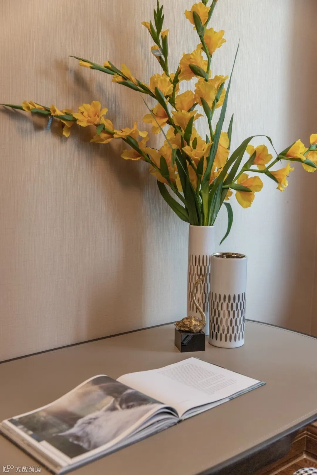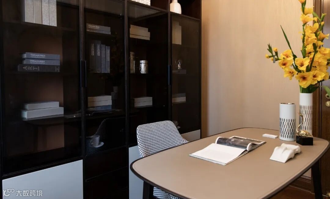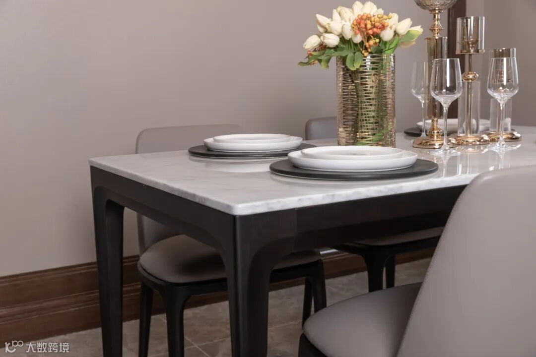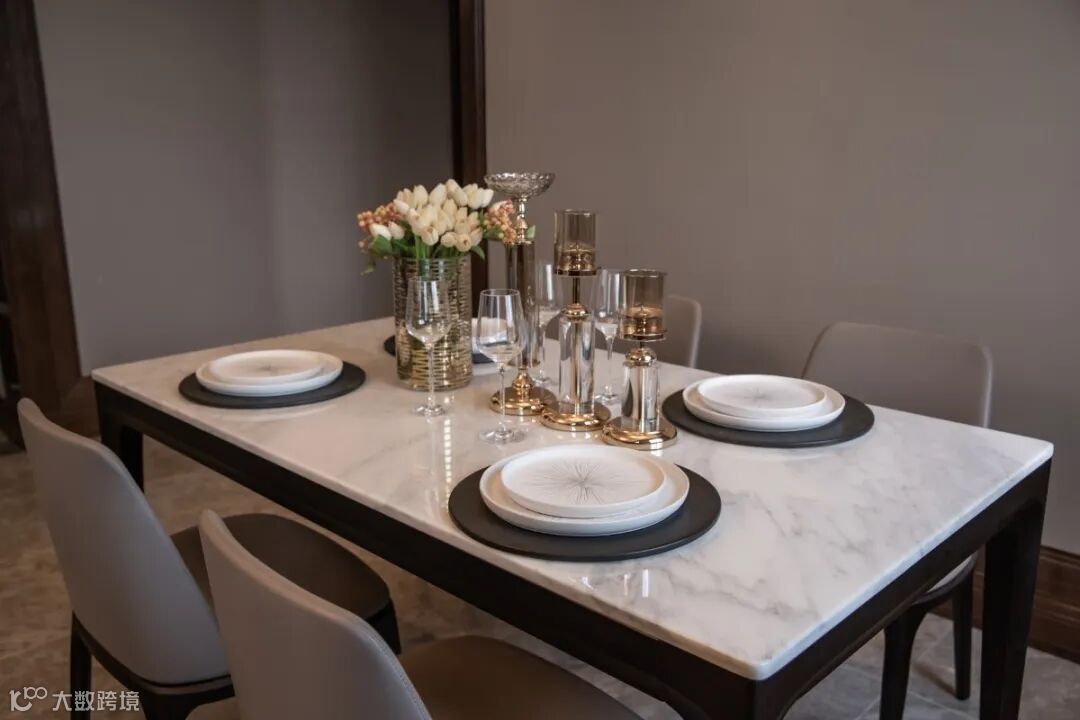 餐厅的墙面延续了客厅的浅咖色调,搭配深黄色木线条,塑造出明快干练的气质空间。家具的选择突破了传统家具对木材的眷恋,通过石、木、皮等不同材质的和谐结合,塑造出现代简约的居家氛围。北欧风格的装饰品和餐具,以其独特的光泽,折射出唯美的视觉感。