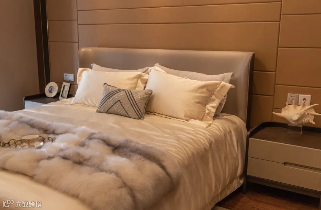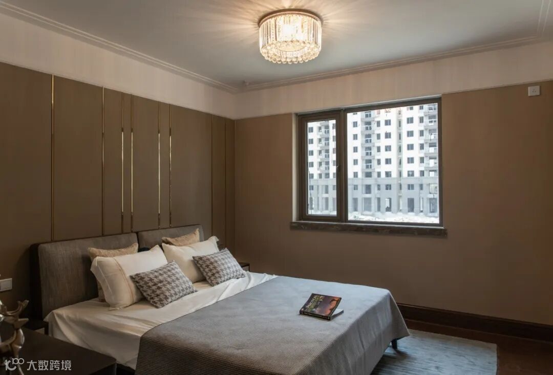 整套卧室以浅雅的灰色打底,线条清晰,取色纯净的牛皮软包床给人一种娴淑优雅的感觉。金属质感的吊灯,映衬着吊顶边框,展现出时尚个性的风采。