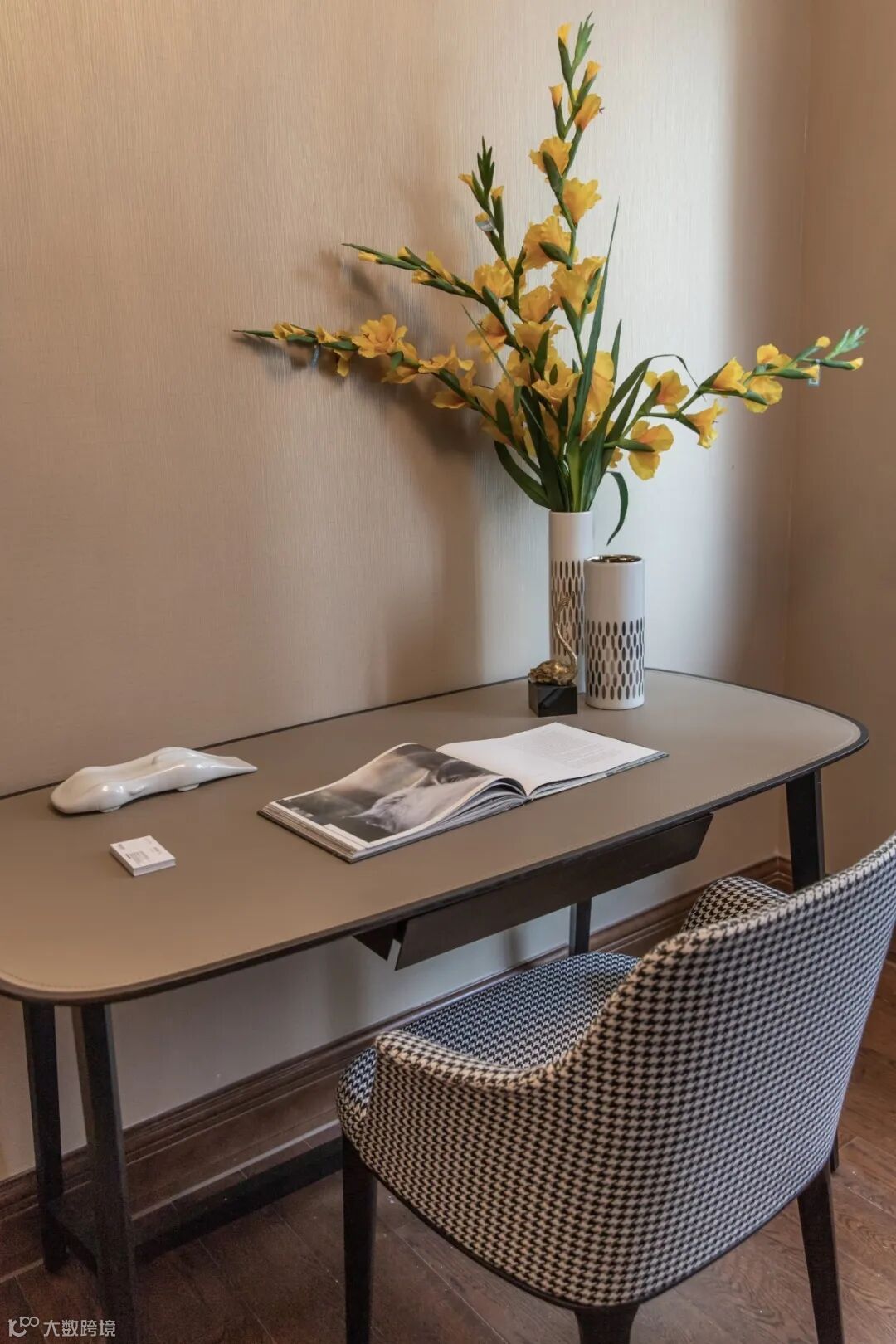 无论是木质地板还是家具,大面积采用灰色调的书房空间,散发出柔和的温度和与自然融合的舒适感。书桌的前方,摆放洛可可风格单人休闲椅,优美的轮廓线条与精致的软包布艺相得益彰,对于空间的整体风格起到画龙点睛的作用。