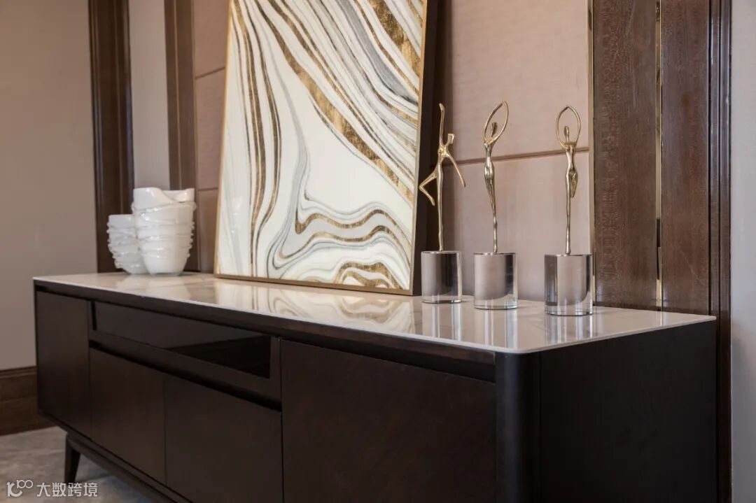 浅咖色墙纸配浅灰色花纹大理石地面,形成一种沉静高雅的中性基调;贯穿客厅的金属色装饰线条,映射出完美光晕,带来惊艳的视觉效果;大理石面的电视柜与茶几、以及高级黑色沙发组合皆成为空间的亮点,共同演绎着时尚与上雅风华。