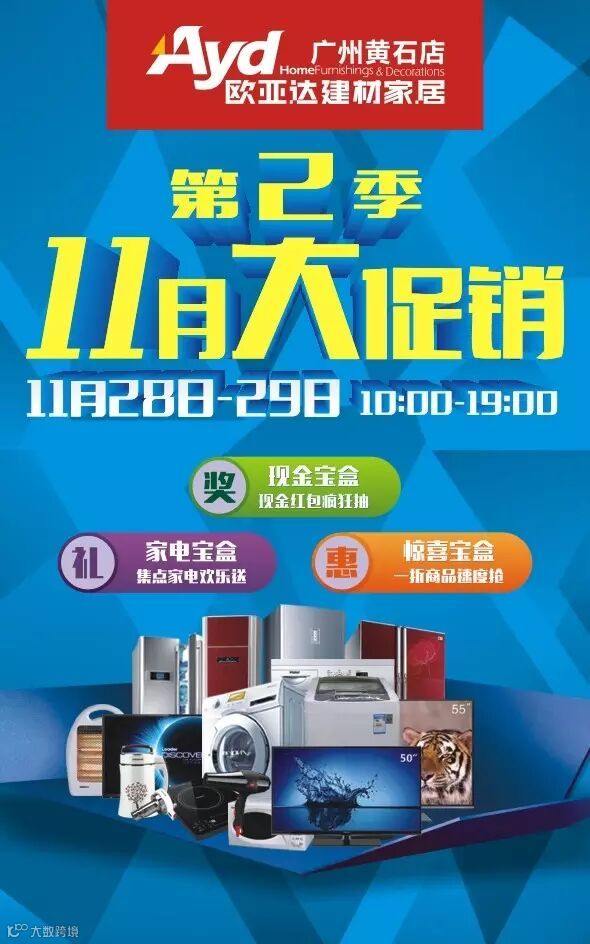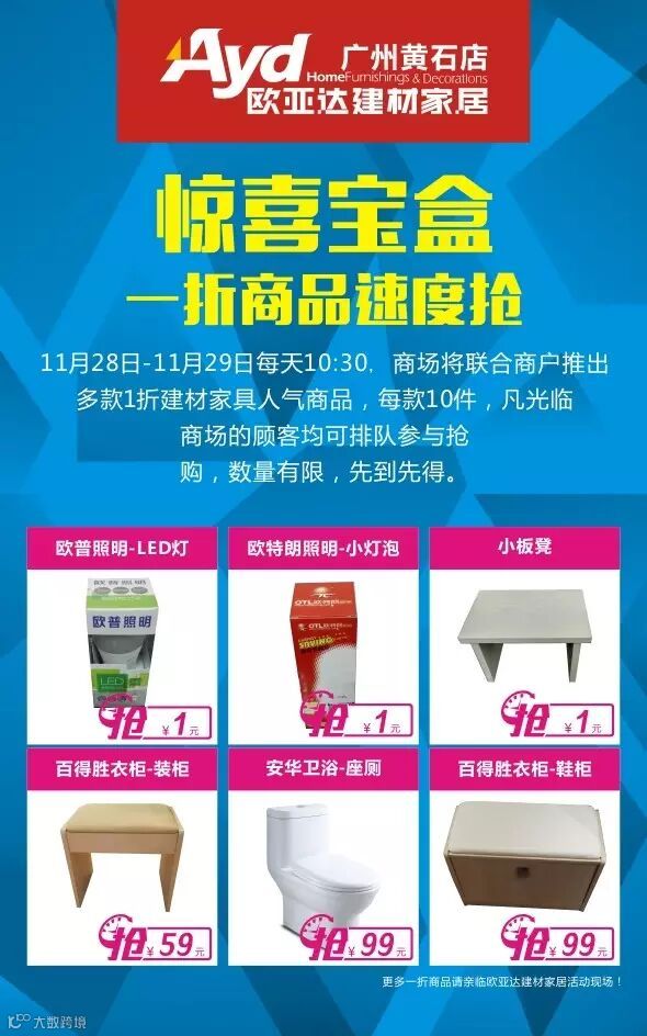活动详情:11月28日-11月29日每天10:30,商场将联合商户推出多款1折建材家具人气商品,每款10件,凡光临商场的顾客均可排队参与抢购,数量有限,先到先得。