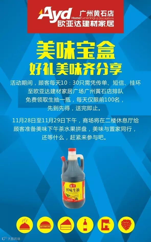 活动详情:活动期间,顾客每天10:30只需凭传单、短信、挂环至欧亚达建材家居广场广州黄石店排队免费领取生抽一瓶,每天仅限前100名,先到先得,送完即止。活动期间,11月28日至11月29日下午,商场将在二楼休息厅给顾客准备美味下午茶水果拼盘,美味与置家同行,还等什么,赶紧来参与吧。