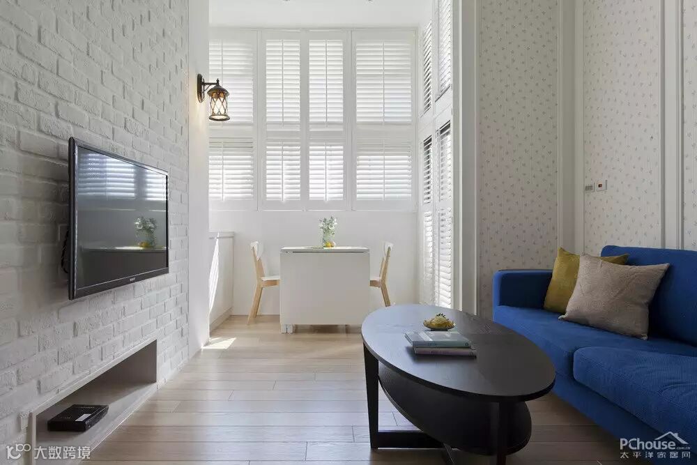 简洁的白色,地中海蓝的沙发,干净而明亮