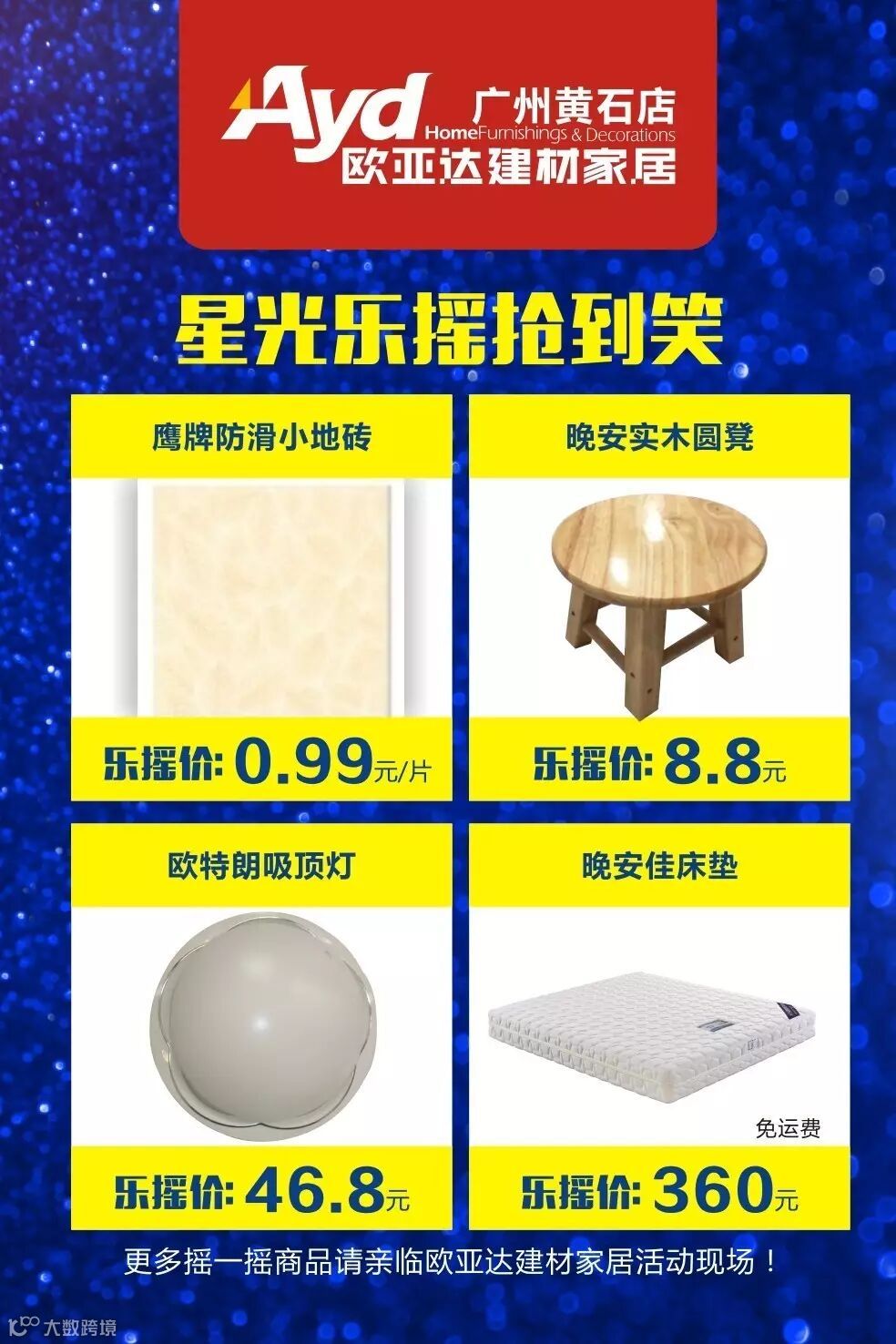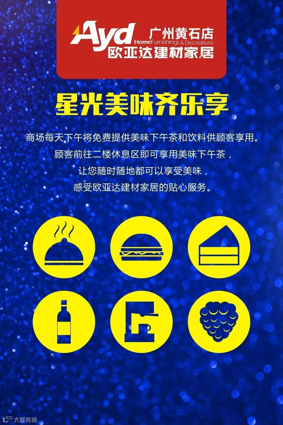 活动详情:商场每天下午将免费提供美味下午茶和饮料供您享用。您可前往休息区享用美味下午茶,活动期间更有工作人现场派送饮品,让顾您时随地都可以享受美味,感受欧亚达建材家居的贴心服务。