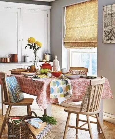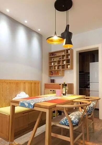 原木色是这个餐厅的主色调,暖黄色的餐桌和餐椅经过吊灯的照射,洋溢着甜蜜的感觉。小清新风格的桌旗与靠垫不失为整个空间的点睛之笔 ~