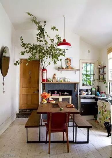 纯白色墙面搭配浅色木质地板,美式乡村风的感觉马上出来了 ! 再加点茂盛的绿植,餐桌选用原色木质的材料,这个餐厅吃的是森林的味道 ~