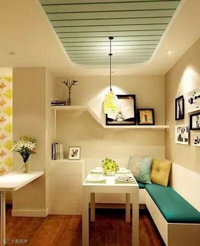 现代风格混搭地中海风,L 型座椅为这个不大的角落省下不少空间。浅蓝色吊顶营造地中海的休闲氛围,墙面收纳让进餐的时光更加温馨。