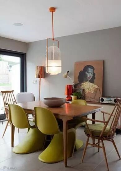 浅灰色墙面与瓷砖使这个餐厅略显黯淡,但是有了黄绿色的独特座椅点缀,这个空间又变得活跃起来。怀旧装饰画和吊灯让餐厅增加了混搭的设计感。