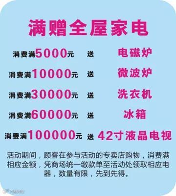 活动详情:活动期间,顾客在参与活动的专卖店下单,实缴满规定金额,即可凭商场统一缴款单至活动处领取相应电器,数量有限,先到先得。满额即送42寸液晶、冰箱、洗衣机、微波炉、电磁炉等全屋家电。