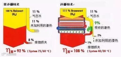 传统锅炉中,排烟温度一般在160~250℃,甚至更高,使得燃料燃烧时产生的水在烟气中处于过热状态的水蒸汽,随烟气从烟囱中流失,传统锅炉热效率一般只能达到85%~91%。