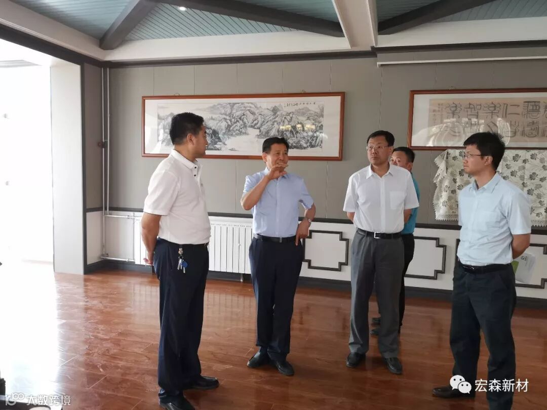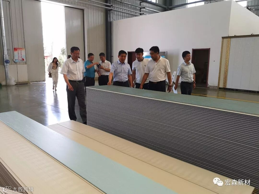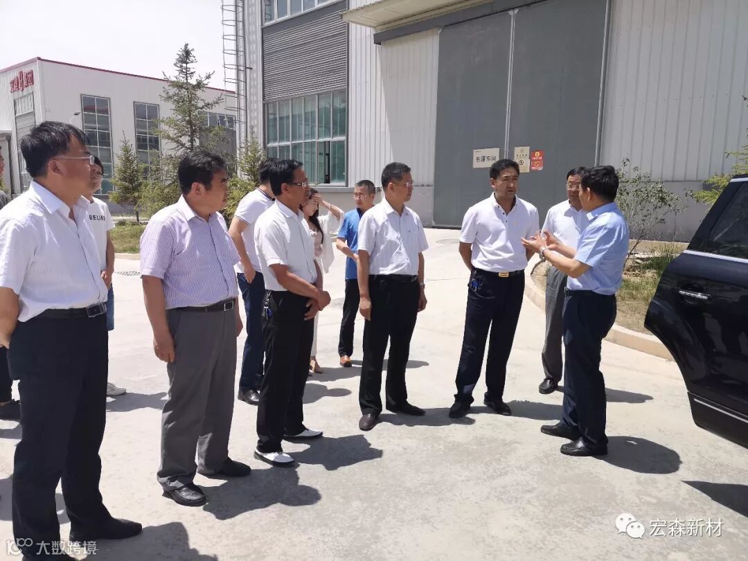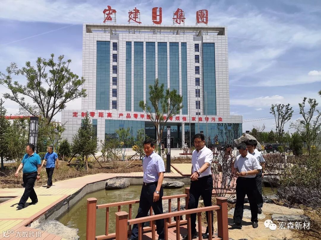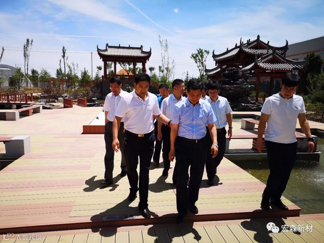 2018年6月14日,中国建材联合会乔龙德会长在甘肃省建筑材料工业协会党组书记、会长朱建海,中国八冶建设集团董事长李万福,中建材祁连山水泥集团董事长脱利成,兰州蓝天浮法玻璃集团、兰州市工业投资集团董事长刘伟,中国建材报甘肃站站长王焱田等领导陪同下莅临宏建集团兰州新区新材料科技产业园。集团公司党委书记、董事长田炫宏及公司相关领导对考察团的到来表示热烈欢迎,并陪同考察团先后对甘肃宏森新材料科技有限公司办公大楼生物质新材料产品装饰的效果展厅、户外园林景观、生物质新材料生产线以及后处理车间进行了全面细致的调研、观摩。