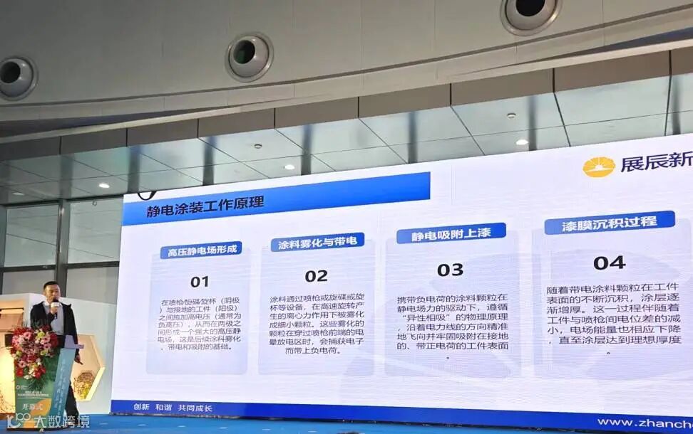 展辰新材技术管理中心机械涂装部经理夏全辉在展会上重点分享了水性及UV涂料静电涂装技术的应用实践,从设备适配、工艺参数到喷涂效率与环保效益,系统呈现了静电涂装在家具制造中的落地路径,引发众多观展企业的关注与探讨。