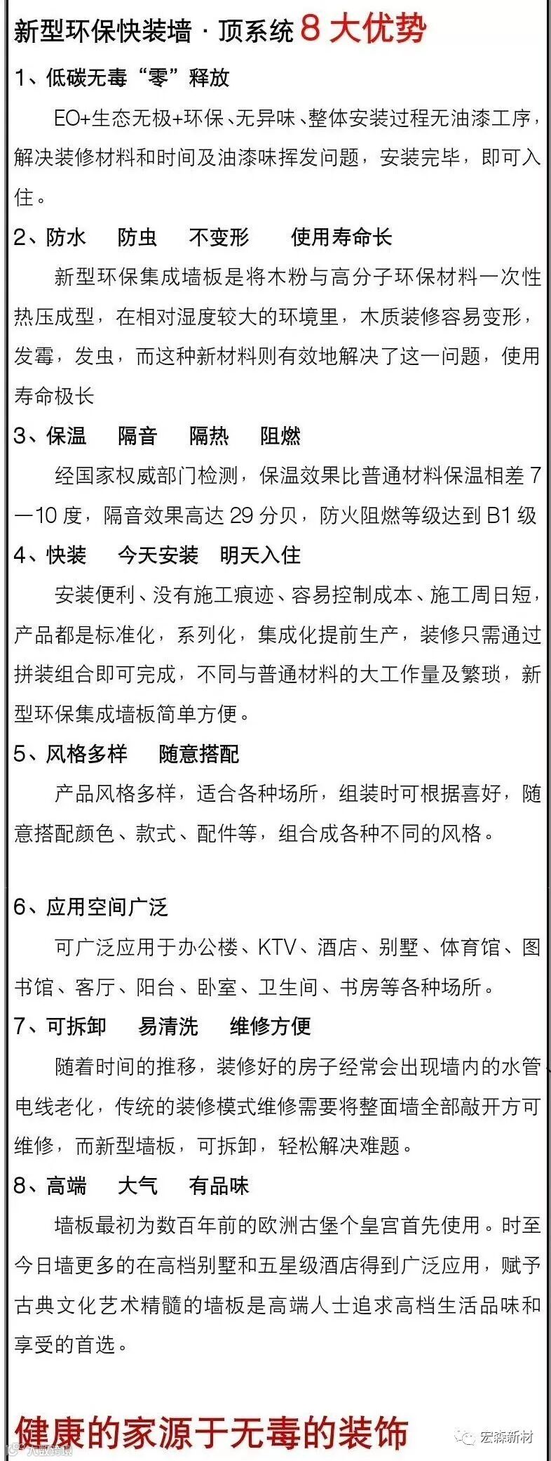 随着现在生活、工作节奏的加快,城乡居民更加注重生活品质的提高和健康、环保的居住环境。甘肃宏森新材料科技有限公司以健康、环保为己任,倾力打造出具有高科技含量的零甲醛生物质家装新材料,实现了今日装修,明日入住,生态循环,绿色共享的发展理念。各种产品款式新颖、风格多样、色彩丰富、节能环保、安装便捷。结合时尚高雅、唯美清新、豪华气派等现代潮流元素,同时具备防潮、防霉、抗菌、隔音等特点; 在享受木质感所带来的自然亲切的同时,还能体验实木所不能具备的阻燃、防潮、无味、可自由组合等特点。时至今日,宏森高性能环保生物质复合纤维新材料正以其优质的特性风靡整个装修行业。