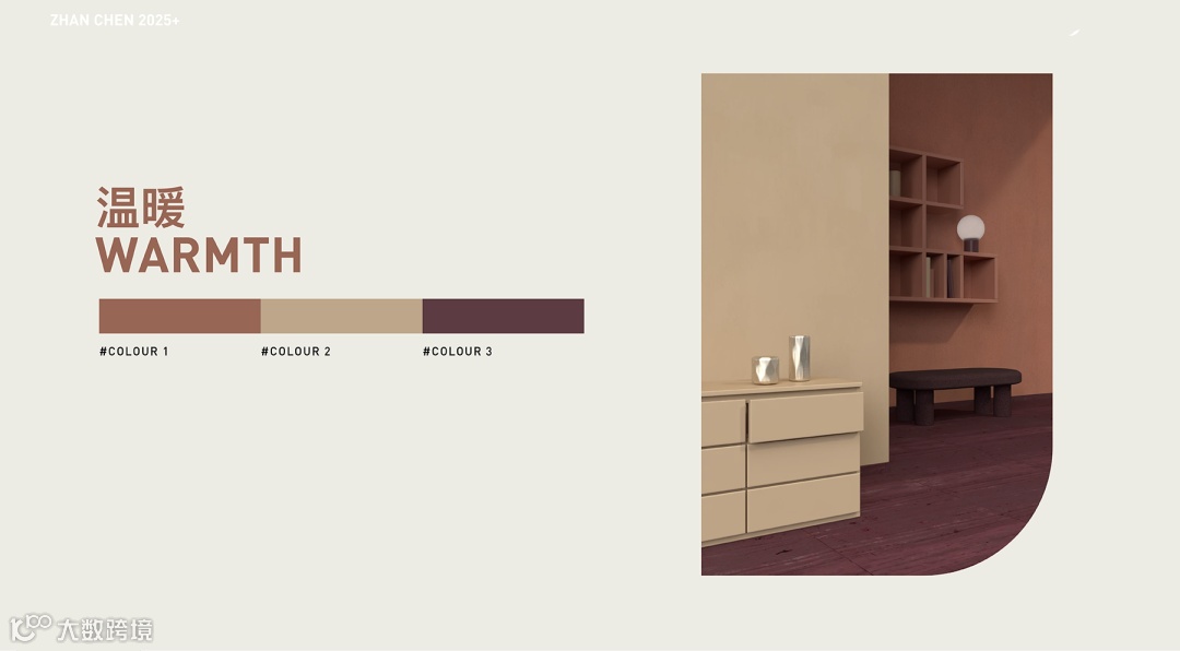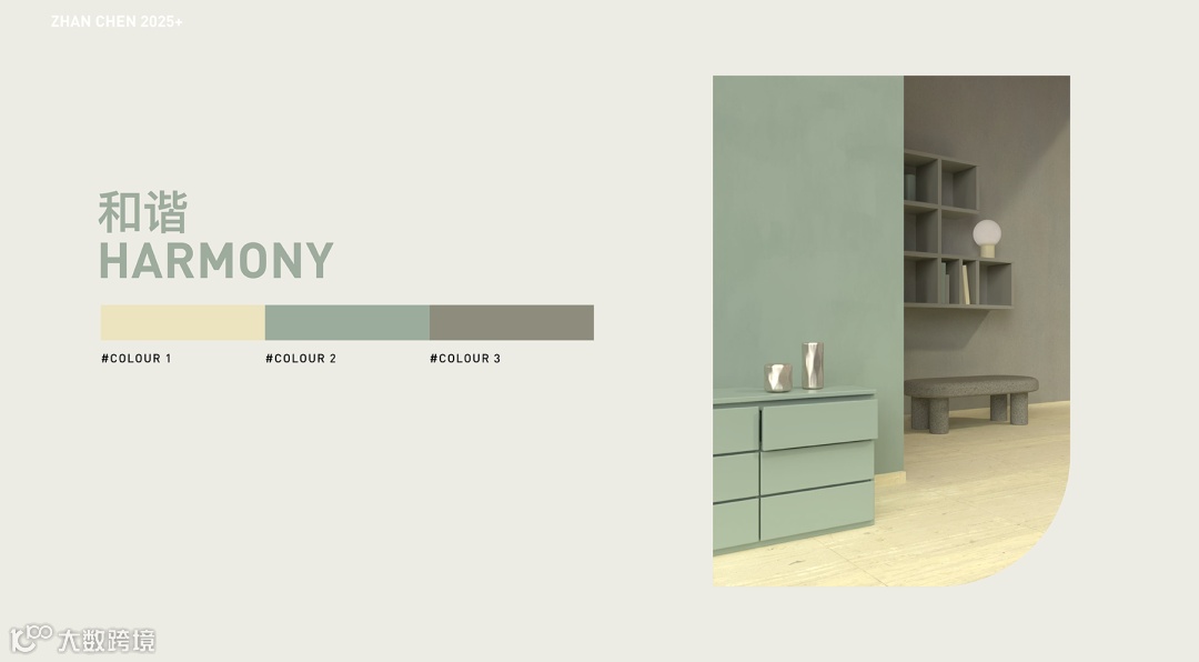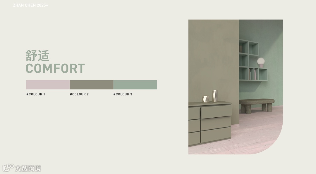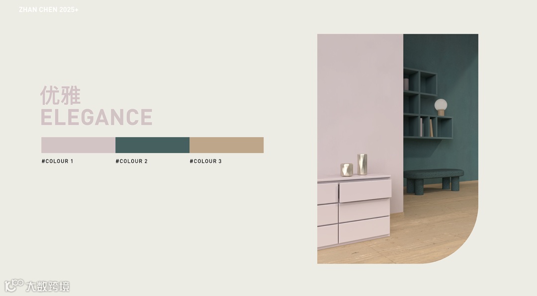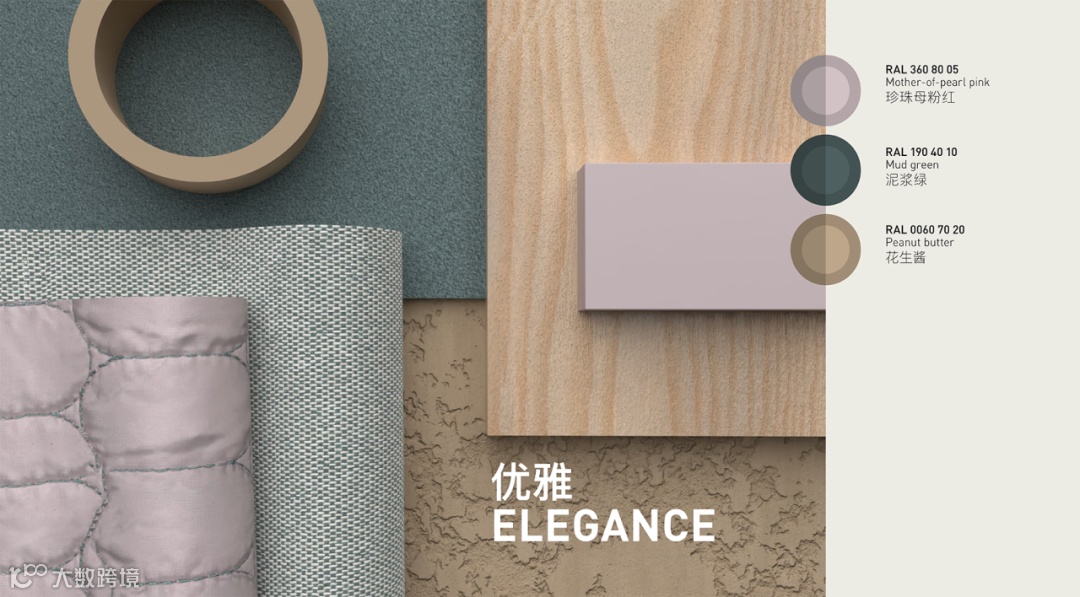 这组配色巧妙融合了珍珠母粉红的优雅、泥浆绿的沉静与花生酱色的温润,既适合追求平衡美学的都市家居,也能满足疗愈系空间的需求,展现出色彩在功能与情感表达上的双重价值。