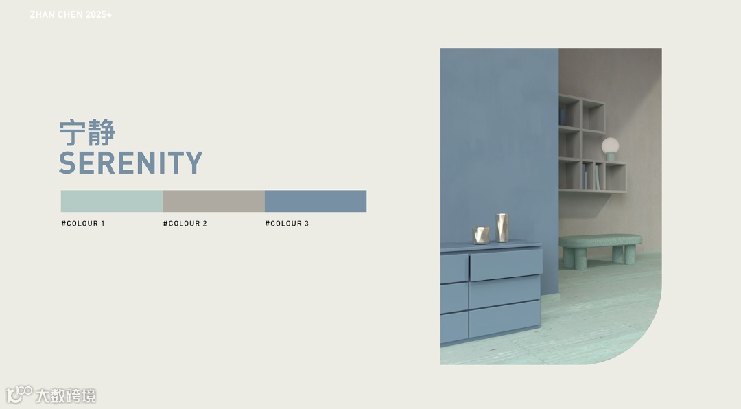 该方案将明水鸭色的清新与建筑蓝的沉稳相结合,平衡了空间的冷暖感,而大蒜米色则作为柔和的背景,进一步增强了整体的宁静感,适合追求沉静与舒适氛围的空间。