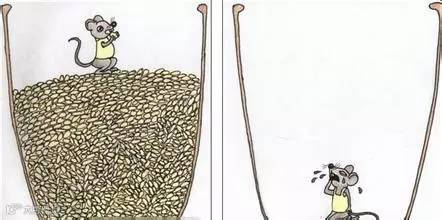 老鼠掉进了半满的米缸,意外让它喜不自禁。确定没有危险后,它便开始了在米缸里吃了睡、睡了吃的生活。很快,米缸就要见底了,可它终究还是摆脱不了大米的诱惑,继续留在缸里。最后,米吃完了,它才发现,跳出去只是梦想,一切都无能为力了。