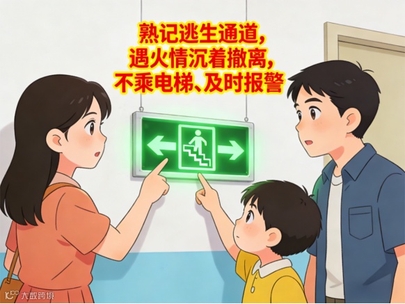 8. 熟记逃生通道,遇火情沉着撤离,不乘电梯、及时报警。