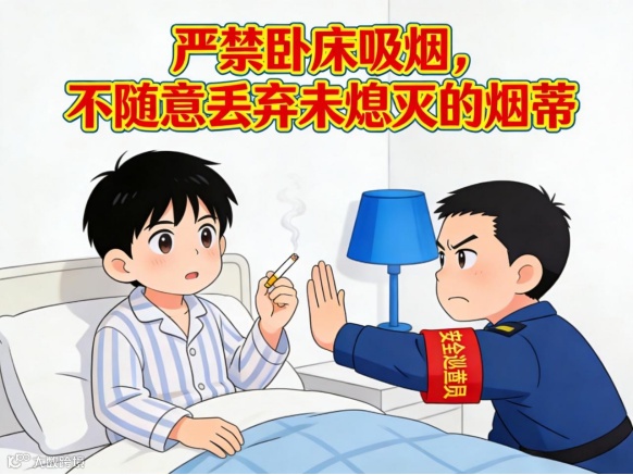 5.严禁卧床吸烟,不随意丢弃未熄灭的烟蒂。