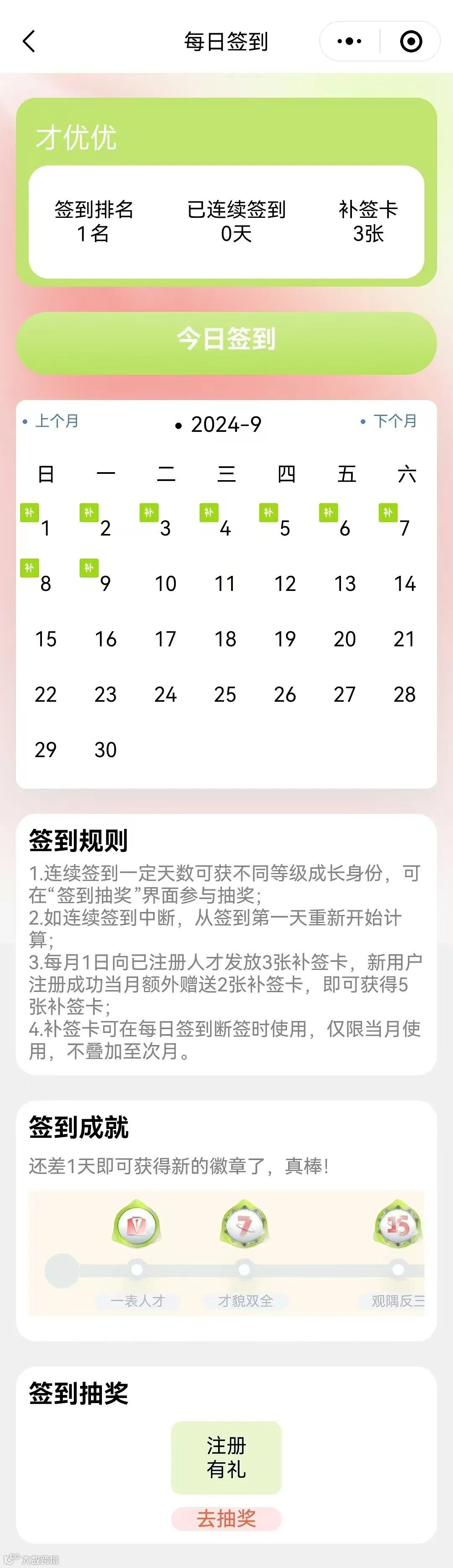 ※假如工作忙碌忘记打卡也没事~我们每个月会赠送您3张补签卡,新注册用户将额外获得2张补签卡,一切只为您满勤打卡,好礼多多等您来拿!
