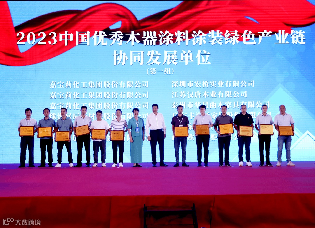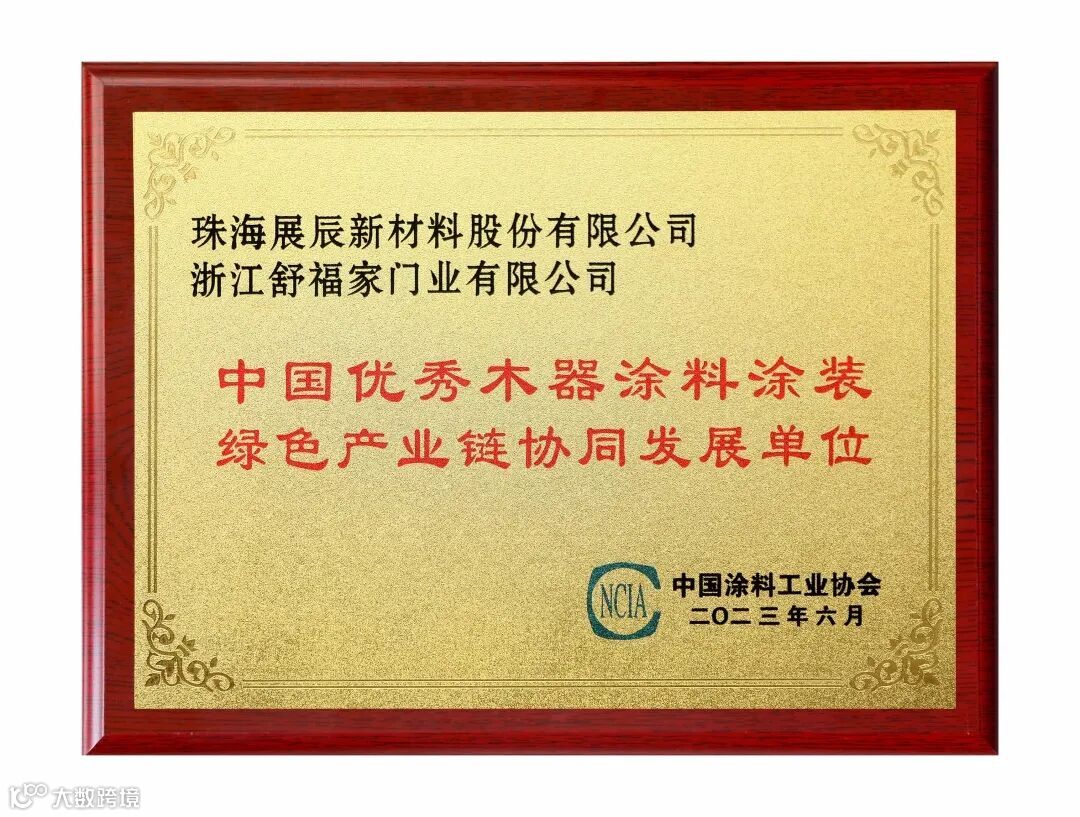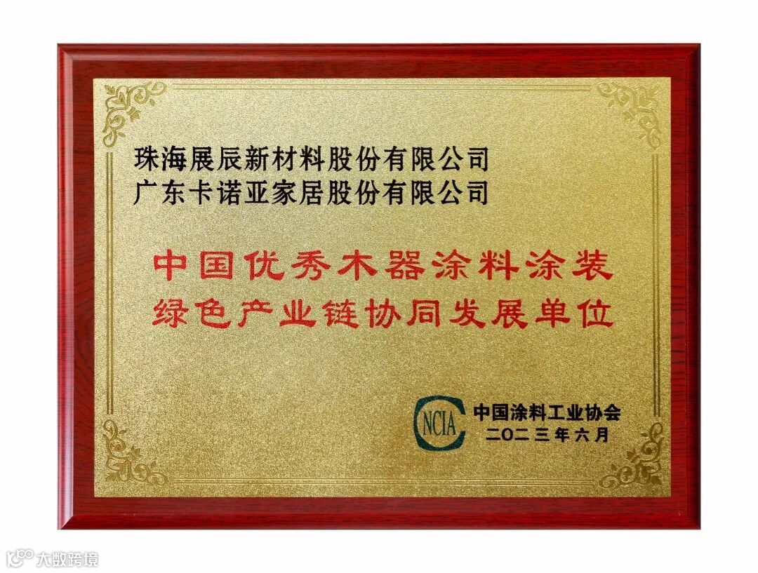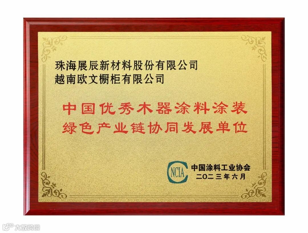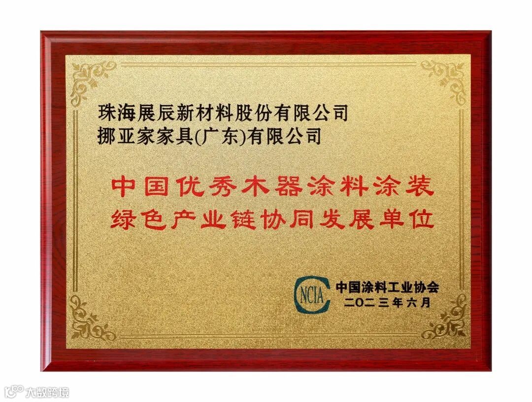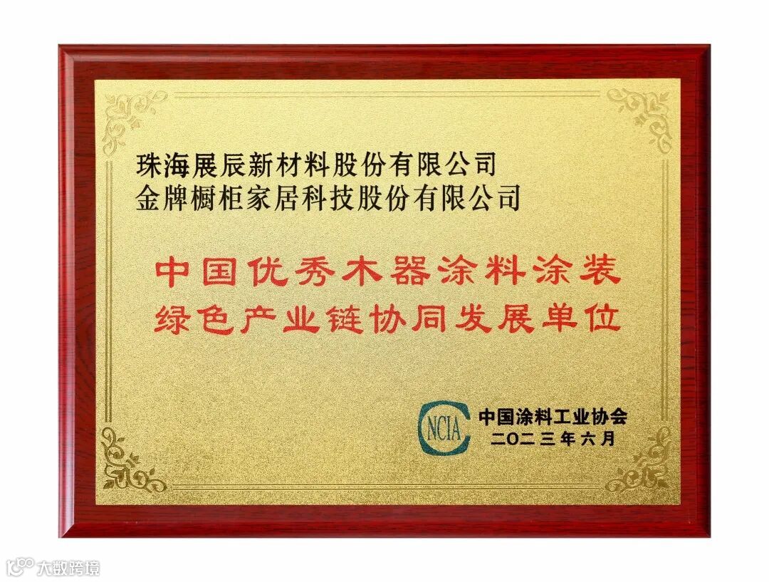 其中,展辰新材与金牌厨柜、卡诺亚家居、挪亚家家具、欧文橱柜、舒福家门业一起,被评为“2023中国优秀木器涂料涂装绿色产业链协同发展单位”。