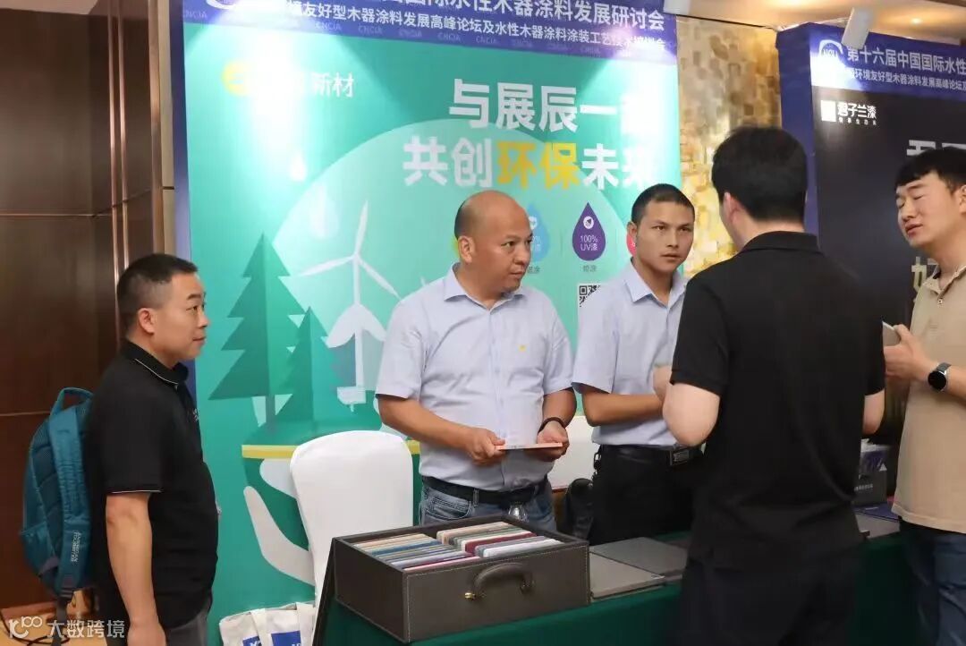 在会场入口的展辰展台,精美的水性木器漆样板也吸引了与会专家和家具企业代表的主动咨询交流。