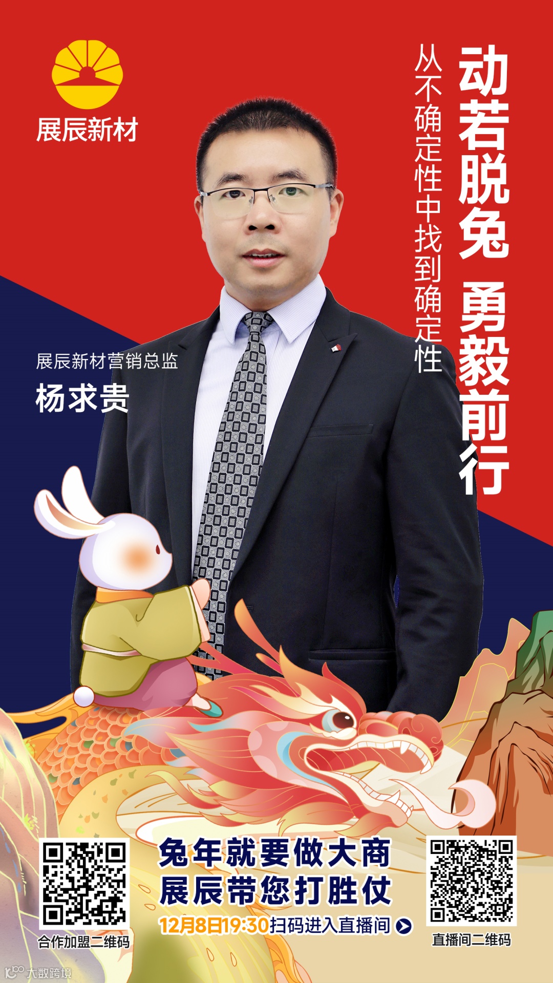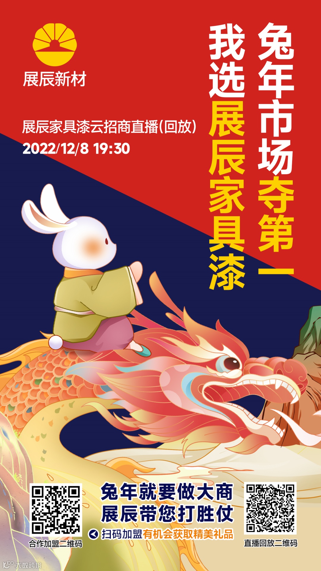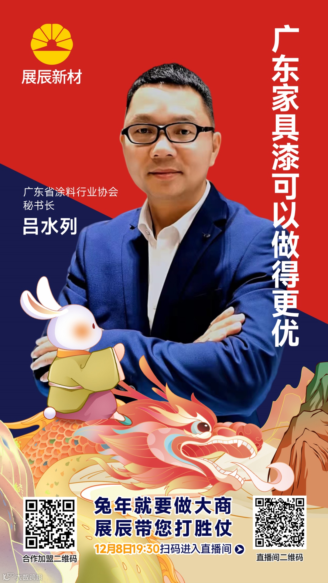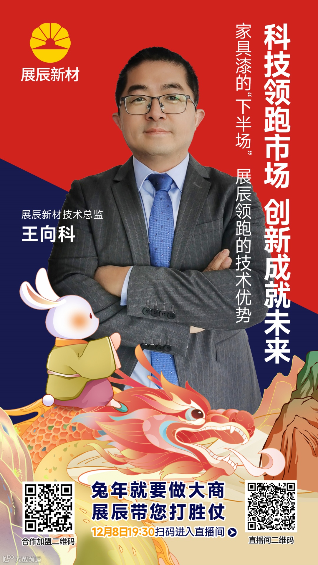 12月8日,展辰新材举办了以“兔年市场夺第一,我选展辰家具漆”为主题的云招商直播活动。直播不仅当场吸引了数万人次观看,现场嘉宾更是妙语连珠,并从各自的视角分享了满满的干货。