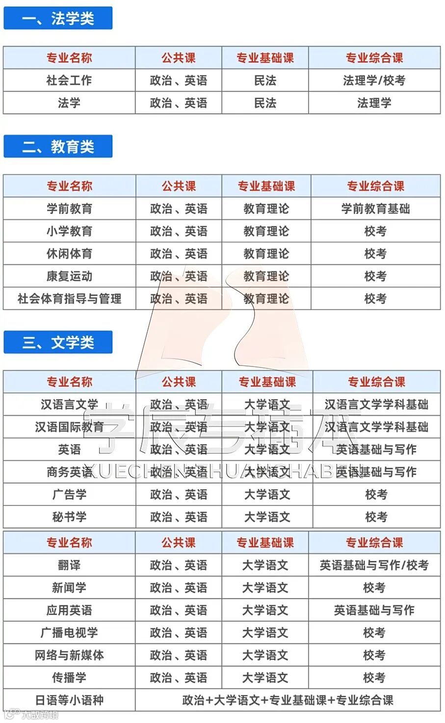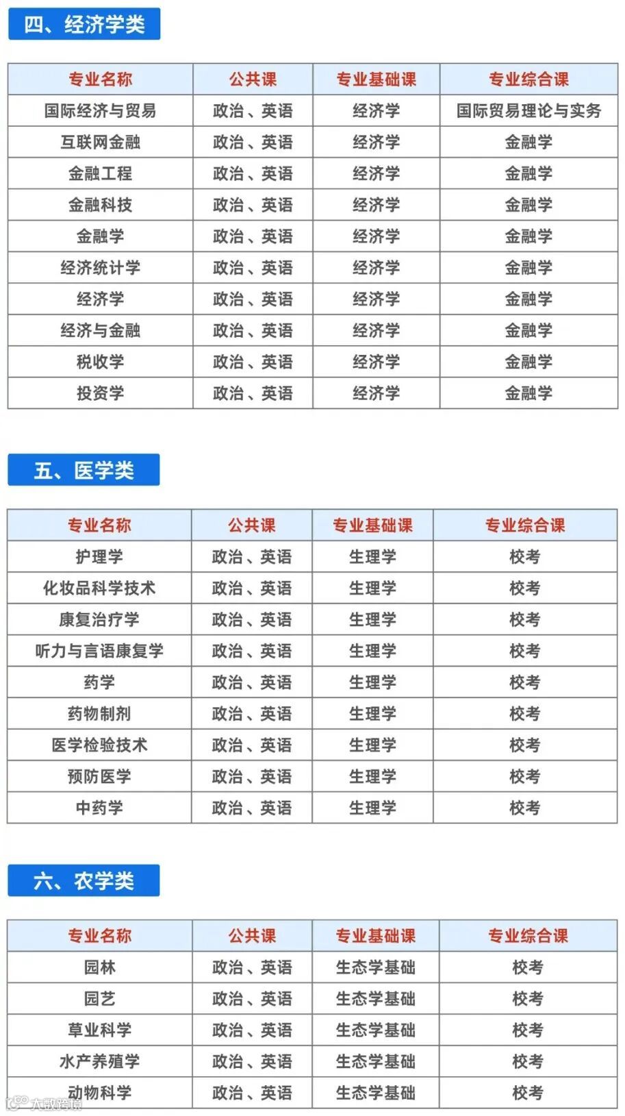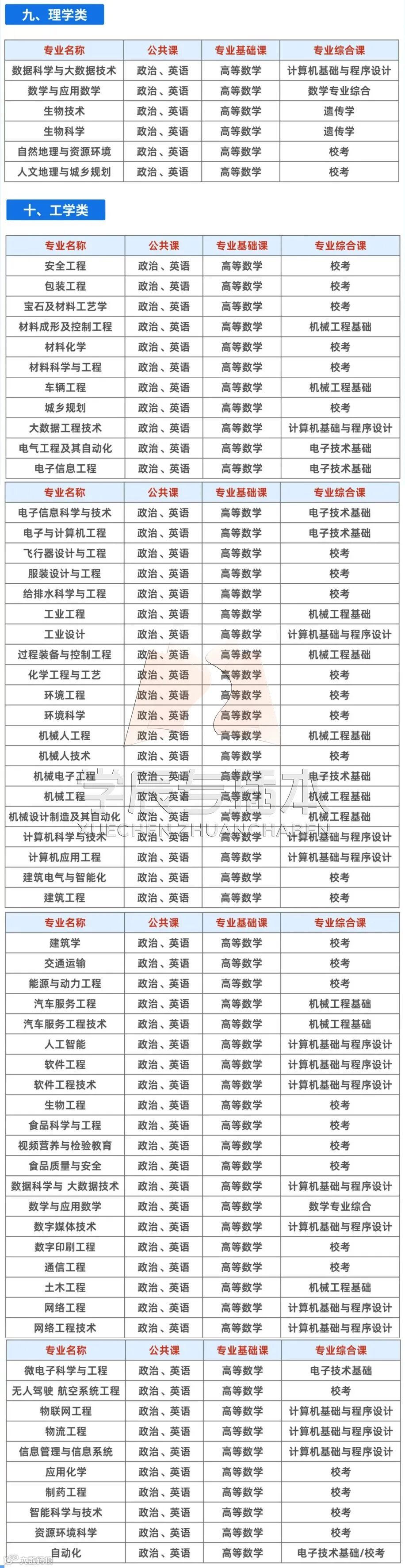 法理学、电子技术基础、计算机基础与程序设计、电子商务概论、基础会计学、市场营销学、人力资源管理、行政管理学、金融学、设计基础、国际贸易理论与实务、数学专业综合、英语基础与写作、汉语言文学学科基础、机械工程基础、遗传学、学前教育基础