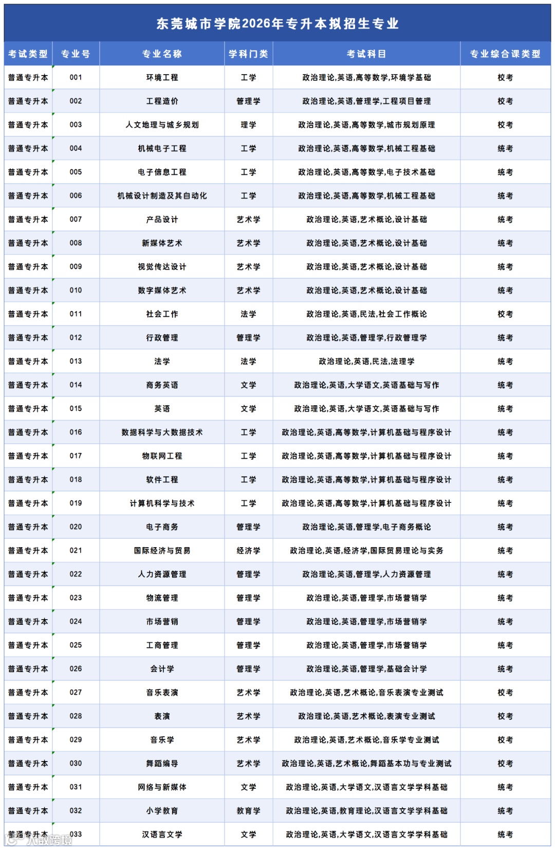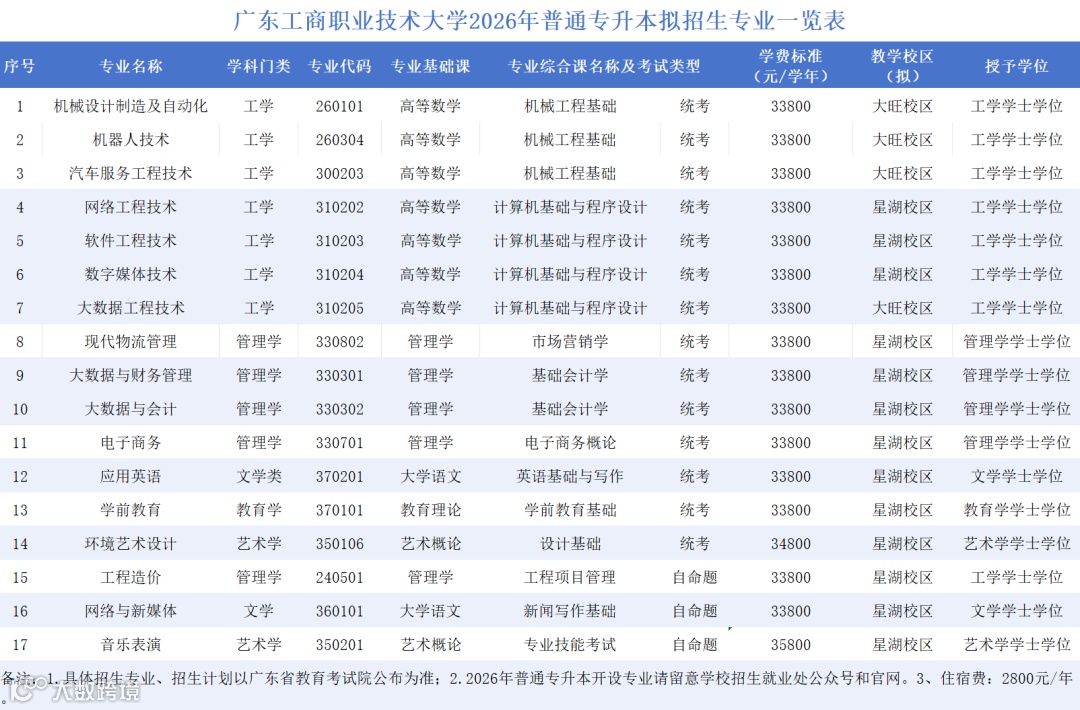 广州工商学院2026年普通专升本(普通批)拟开设31个普通专升本招生专业,新增大数据管理与应用、数字经济、金融科技、学前教育专业,现将拟招生专业公布如下: