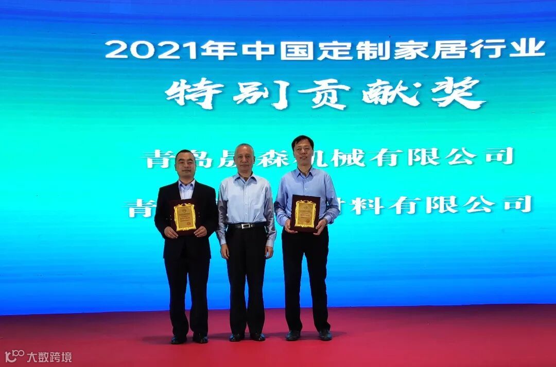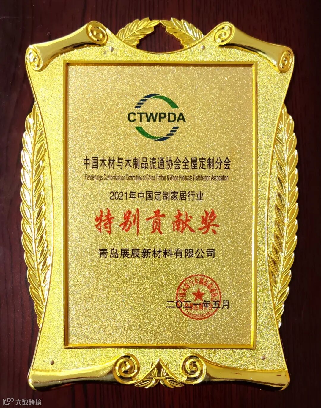 晚宴期间还举行了盛大的颁奖典礼。展辰新材获得大会领导和行业高度肯定,荣获“2021年中国定制家居行业特别贡献奖”。