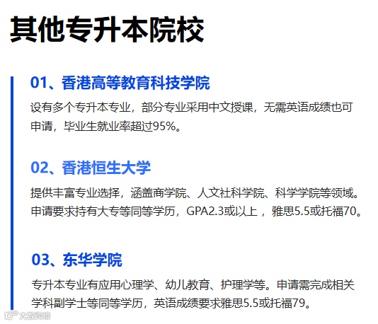 大专毕业生:已经获得副学士/高级文凭,大专毕业生希望通过专升本课程获得香港学校的学士学位。