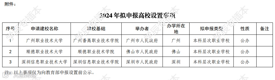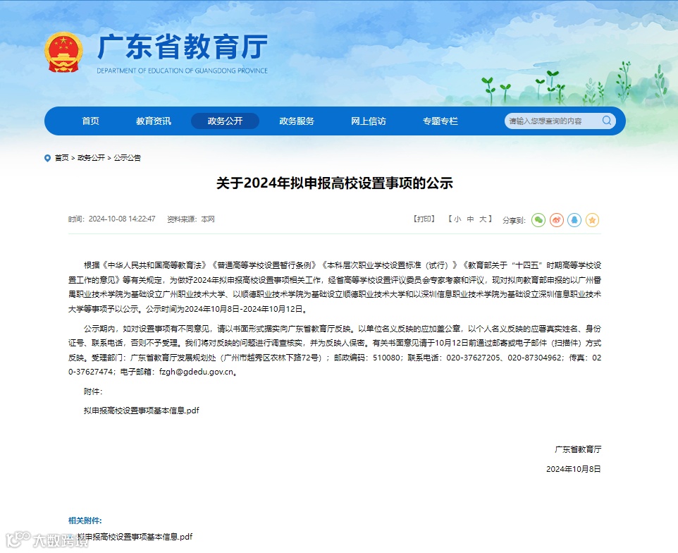 根据《中华人民共和国高等教育法》《普通高等学校设置暂行条例》《本科层次职业学校设置标准(试行)》《教育部关于“十四五”时期高等学校设置工作的意见》等有关规定,为做好2024年拟申报高校设置事项相关工作,经省高等学校设置评议委员会专家考察和评议,现对拟向教育部申报的以广州番禺职业技术学院为基础设立广州职业技术大学、以顺德职业技术学院为基础设立顺德职业技术大学和以深圳信息职业技术学院为基础设立深圳信息职业技术大学等事项予以公示。公示时间为2024年10月8日-2024年10月12日。