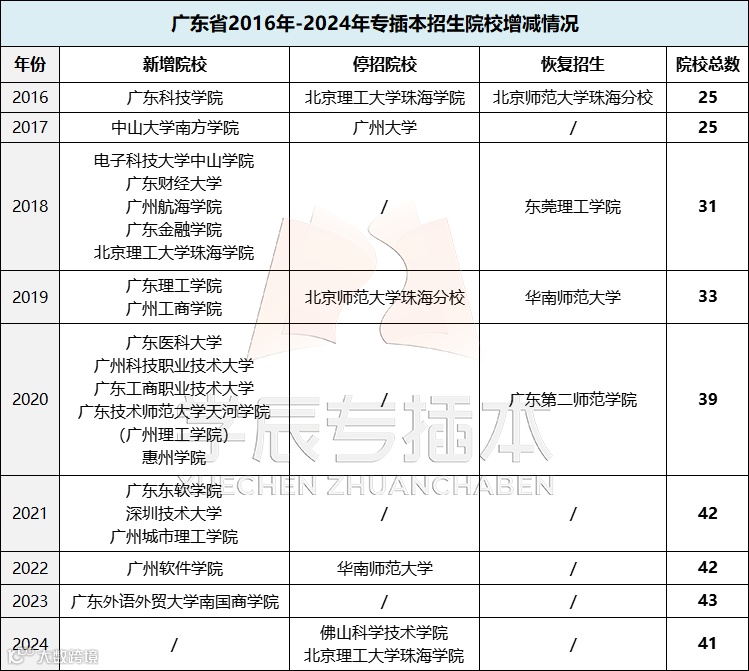 2024年专插本没有新增院校,佛山科学技术学院、北京理工大学珠海学院取消招生。