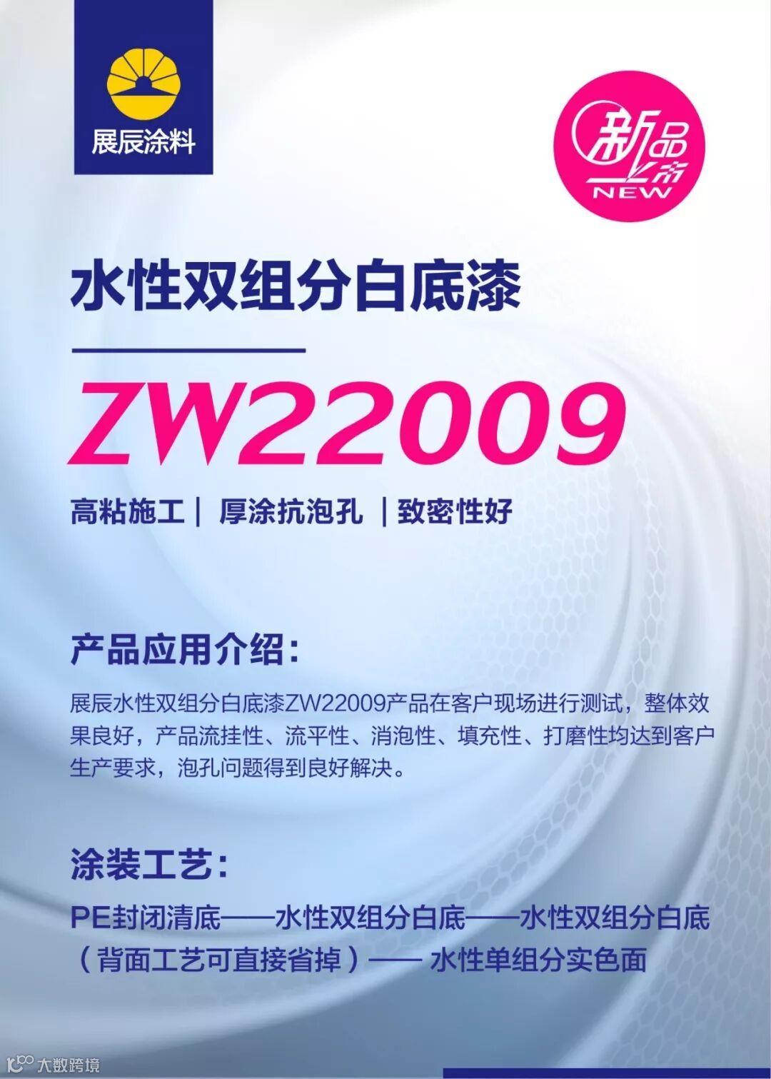 展辰ZW22009水性双组分白底漆,遮盖力、丰满度、流挂性、流平性等关键性能超越行业同类产品,在厚涂抗泡孔方面更是达到行业顶尖水平。