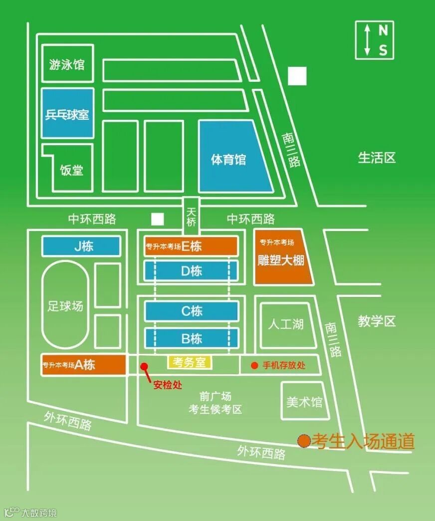 (一)考试前,学校考场不开放提前进校查看,请考生尽量提前1小时到达考点,所有考生务必从大学城外环西路教学区美术馆入口处进校,考生须按照考点要求依次排队通过智能安检门进入考场区域。凭专业准考证、身份证参加考试。