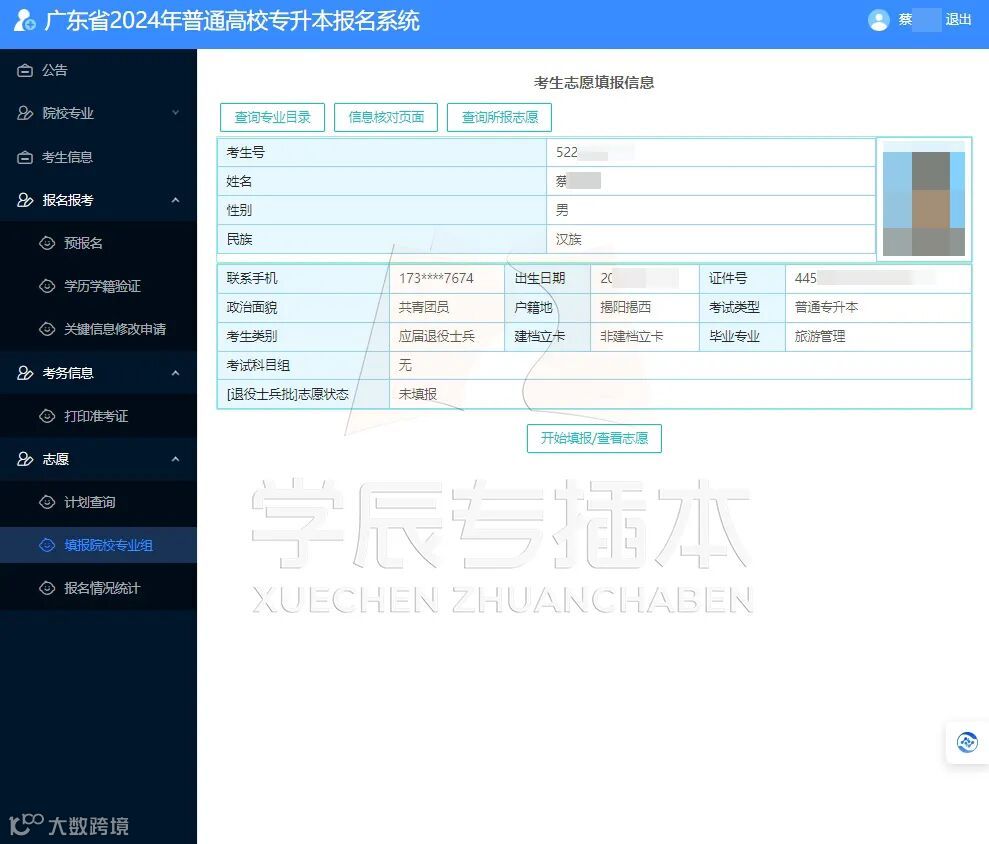 进入填报专业组页面,请考生务必确认信息无误,然后点击开始填报按钮。