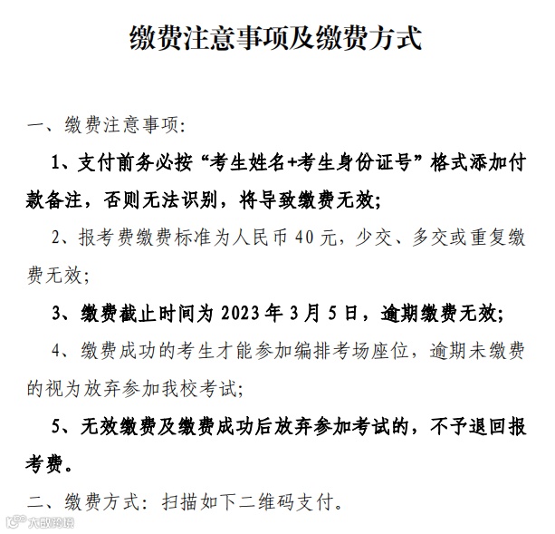 根据《广东省2023年普通高等学校专升本招生工作规定》(粤招办普〔2022〕52号)文件精神,成功报考我校自行命题专业综合课《设计综合》的考生,须交报考费40元,缴费截止时间3月5日,缴费成功的考生才能参加编排考场座位,逾期未缴费的视为放弃参加考试。缴费注意事项及缴费方式详见附件。缴费成功的考生才能打印准考证,准考证打印事项预计于3月20日后公布。