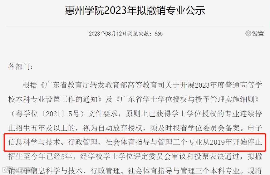 11日,惠州学院公示2023年拟撤销专业:电子信息科学与技术、行政管理、社会体育指导与管理三个专业,从2019年开始停止招生至今年已经5年,经学校学士学位评定委员会审议和投票表决通过,拟撤销电子信息科学与技术、行政管理、社会体育指导与管理三个本科专业。