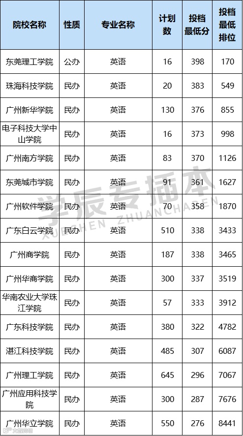 尽管该专业招收的院校没有会计学多,但是整体专业竞争比甚至比管理类专业还高。英语的最低投档线为276分,足足高出省线70分,而且招生计划数也非常多,综合数据来看,英语专业对比其他专业应该在民办院校中也是比较难考的了。