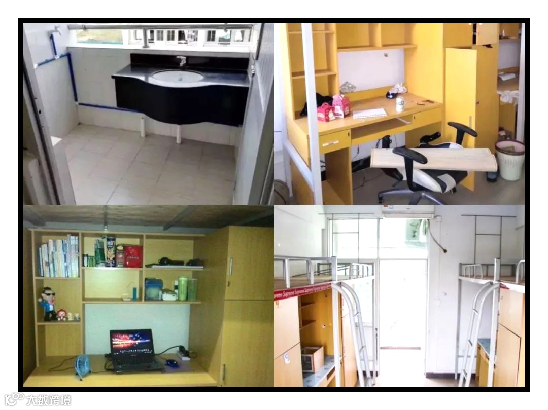 普通宿舍为标准的四人间,上床下桌的配置,有独立的阳台与卫生间,宿舍内部设施齐全,有直饮水机、热水器、空调,衣柜等日常生活设施,大部分宿舍配备洗衣机。