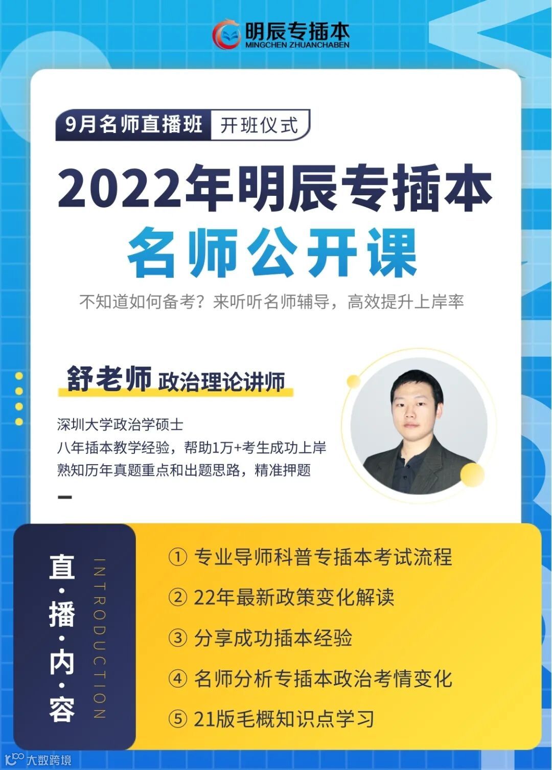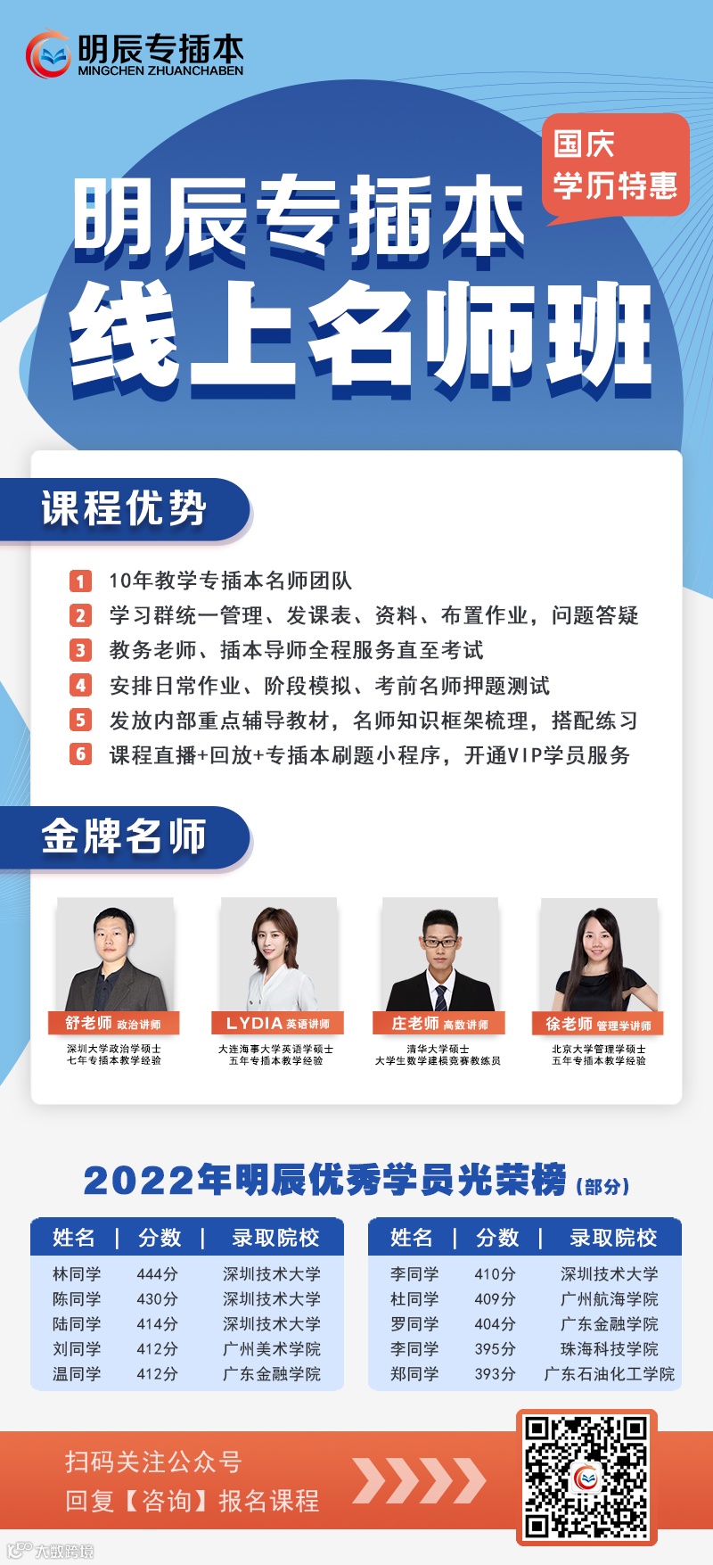 那么如何在竞争如此激烈的考试中战胜对手,考上心仪的本科院校?明辰为明年考试的插本考生争取到福利啦,开设了插本名师公开课,时间长达3小时,满满的干货,免费获取!