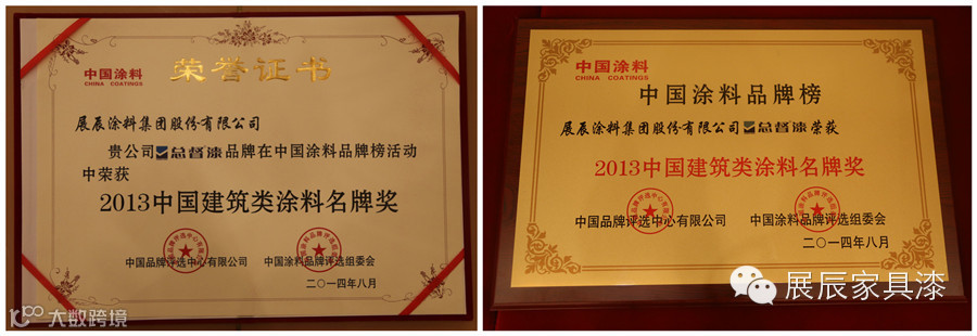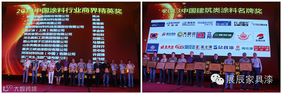 会议同时对2013年度表现优异的品牌及企业家进行了表彰,展辰涂料集团获得了主办方(中国涂料工业协会)、各位资深专家、以及行业上下游企业全方位的肯定,展辰品牌荣获中国木器涂料名牌大奖,展辰涂料集团旗下总督漆荣获中国建筑类涂料名牌大奖,与此同时,展辰涂料集团董事长陈冰先生还荣获中国涂料行业商界精英奖。